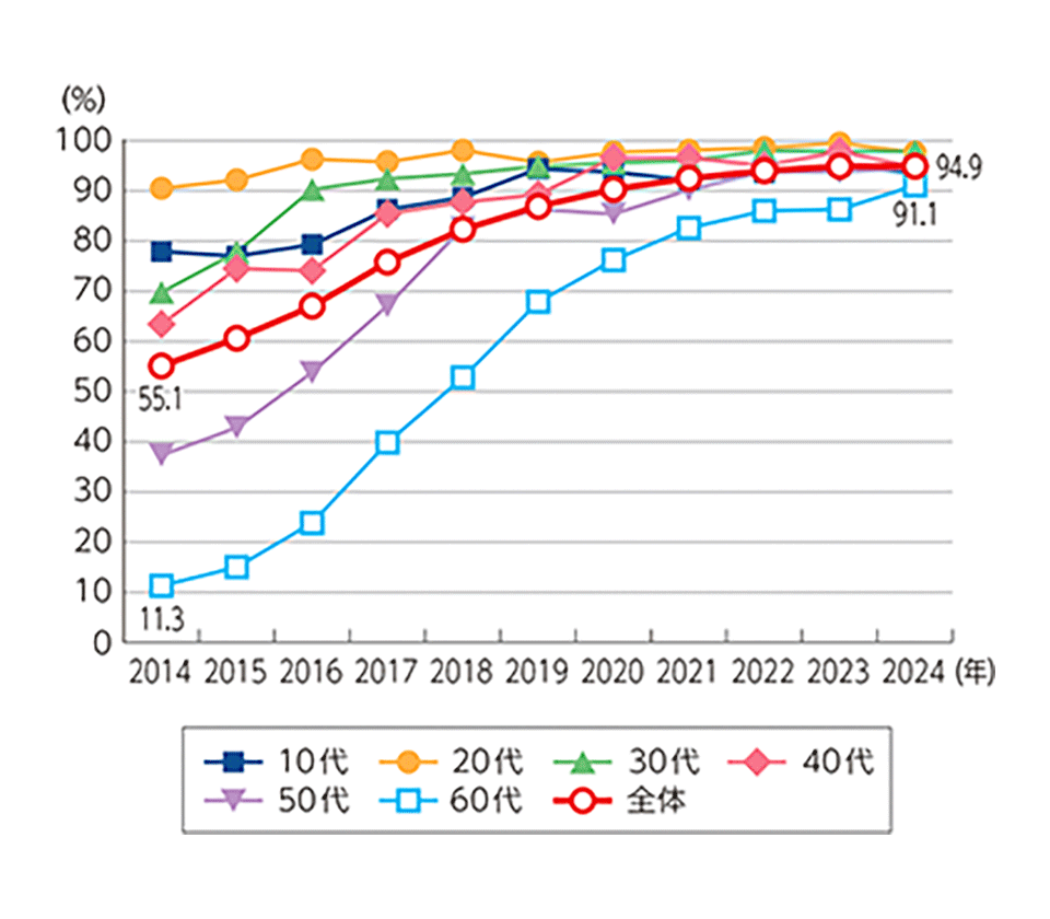 SNSの利用りようりつ推移すいいそうしょうホームページより)